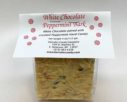 We combine our luscious white chocolate with crushed peppermint hard candy for a winning combination - Peppermint Bark. Of course, we can't make just one type - we also make it with crushed Oreos®! It's a little sad to take a hammer to perfectly good hard candy, but the end result is worth it! Watch how it's made on our YouTube channel.